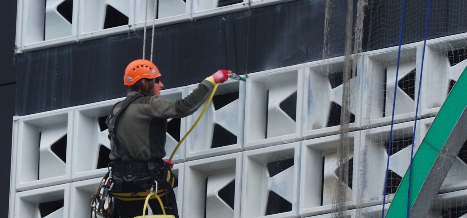 Schwere erreichbare Bereiche wie Fassaden, Dächer oder Fenster in großer Höhe werden mittels spezieller Techniken gereinigt.